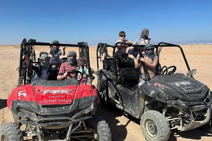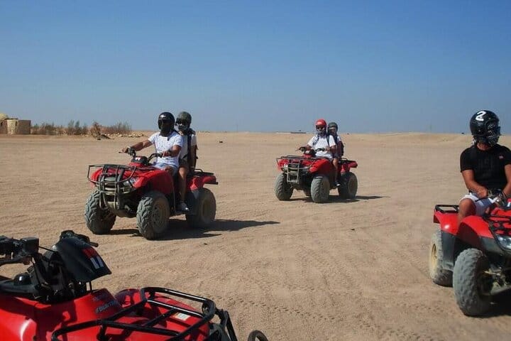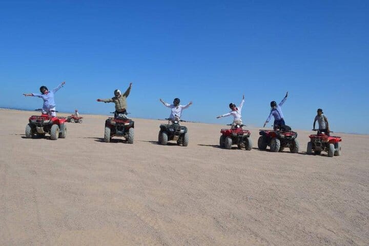 Experience the thrill of the Egyptian desert with the Super Safari adventure in Hurghada. This full-day tour combines the excitement of a Jeep ride and a 4-seater buggy, alongside a serene camel ride and exhilarating quad biking. Visit a traditional Bedouin village to learn about local customs, and enjoy a delicious dinner under the stars, capped off with a lively folklore show. Perfect for adventure seekers and families alike, this tour provides an unforgettable blend of culture and excitement.